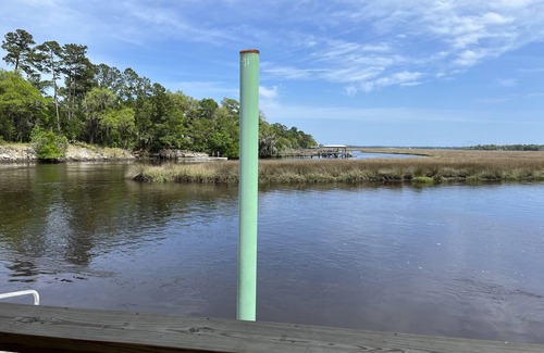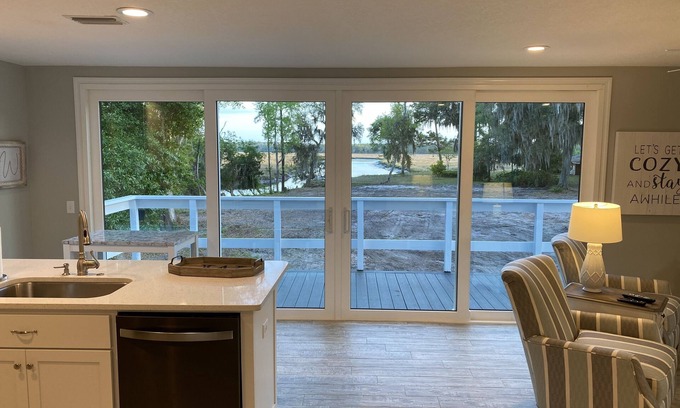 This home is on stilts with gorgeous views of Crooked River. Quietly nestled amongst a 40 acres, this property is conveniently located just 3/4 of a mile from I-95 and 25 minutes from Jacksonville, Florida. This home features a master suite with a king bed, a guest bedroom with two twin beds, with an open kitchen and living room with large 16 foot sliding glass doors, enjoy beautiful views of Crooked River. Savor your morning coffee on the outdoor deck overlooking the river, while relaxing to the sounds of birds chirping and dolphins swimming up stream. There are large, mature oaks with Spanish moss. This is southern relaxation at it finest! This is a one of a kind property to take the weight of the world off your shoulders.