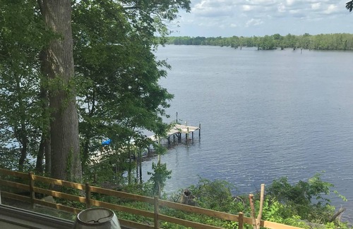 Beautiful view of the Chowan river from a 60' bluff. Recently remodeled, more space added. Great fishing area, nearby boat landing. Large screened in porch to sit and enjoy the view of the river. The cottage is beige in color with a bright blue roof. There are 3 levels to the cottage, with a large stair case going to a bright blue entry door. Or you can walk around to the back and enter the lowest level, and take steps from there. This cottage has 3 different stair cases in it, and unfortunately not handicapped accessible. The cottage will comfortably sleep 5 adults. There are 3 bedrooms on the main level, and a full loft that we have furnished with 2 double beds. There's a kitchen - living room area. The kitchen has all appliances needed to do your own cooking along with everything you need to make and serve your own meals . There is a washer and dryer in the lower level. There is internet and we have a TV with antenna for local stations and a DVD player, with a selection of DVD's to choose from when you aren't out and about.