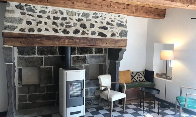 Gite sleeps 4-6, refurbished in 2022, small covered and enclosed terrace, with outdoor dining area. Located in a village with all amenities, in the heart of the Parc Naturel des Volcans d'Auvergne, halfway between the Massif du Sancy and the Chaîne des Puys, 1/2 hour west of Clermont-Ferrand. Peace and quiet, nature, hiking, biodiversity, wide open spaces.