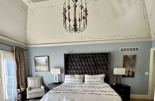 The master suite has hand-painted ceilings, a waterfront patio, an opulent bath with soaking tub, walk-in closet, & laundry room.