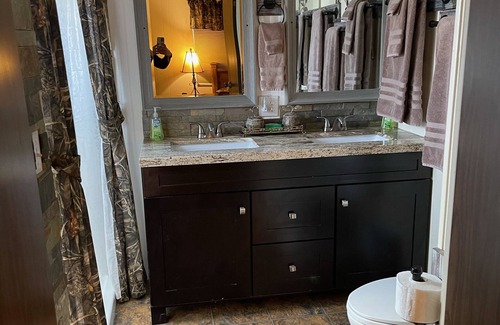 Updated river house has a fully equipped kitchen with granite and new appliances. Master bedroom with king bed and bathroom along with a fold out ottoman. Another bedroom with queen bed and bathroom. Another bedroom with 2 twin beds and bathroom by hallway door. Another bedroom with 2 twin beds and bathroom. Living room has fold out love set and a fold out ottoman. Backyard has fishing on the river and room for outdoor activities. There is patio area with fire pit and gas grill. Spacious parking in front of the house.