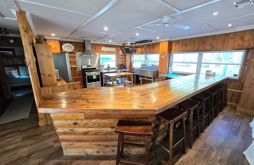 Fully Equipped Kitchen: The heart of the cabin features a 300 sq ft commercial kitchen, perfect for catering your wedding meals or hosting family gatherings. The charming wooden bar allows for entertaining while preparing delicious dishes.
