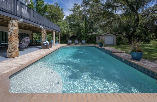 Welcome to the exquisite ✨River Front✨Heated Pool Estate-Large Group/Busch Garden/USF—Sleeps 16, a splendid venue tailored for your dream wedding. With over 4000 square feet of luxurious indoor space, this estate comfortably accommodates up to 16 guests, making it an ideal choice for both intimate gatherings and larger celebrations. Its picturesque outdoor settings, featuring lush greenery and direct river access, offer a romantic backdrop that’s perfect for saying “I do” and creating lasting memories with family and friends.