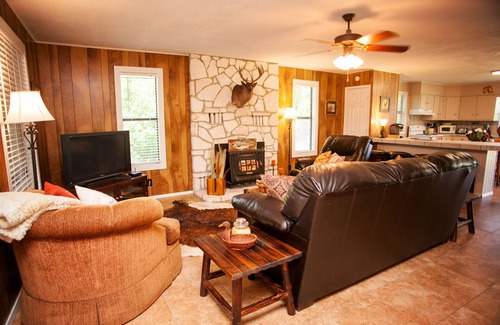 From our Back Deck the sound of Rushing Water will wash away your Stress as you Enjoy the Hill Country at it's finest. The Master Suite has a Private Bathroom, a separate TV satellite, and a King-sized Bed. the Guest Room has a Queen-sized Bed and a large closet. The Third Bedroom has two Twin Beds and a TV for DVDs. There are two more Twin Beds on the Sun Porch with total sleeping for 8.
