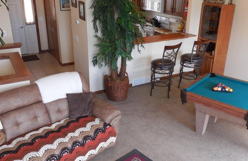 The second level has the laundry that is well stocked with everything you need. From soap to the ironing board you will need. The master bedroom with full bathroom and two comfy XL twin beds, that can be made into one king size bed, and a 43" smart TV. You can also enjoy sitting out on the patio and enjoy the river. The other bedroom has a comfy queen size bed with nice big picture window that looks out to the river, also a 43" smart TV and another full bath just down the hall. Both bedrooms have alarm clock, dresser, lamps and nice size closets.