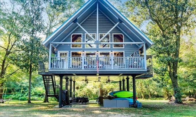❤️ River access from a cozy log cabin with picturesque grounds! Beautiful year-round, built for experiencing southern nights! This private, elevated cabin allows you to experience nature and country air, while affording you with all the comforts of home. The cabin is set on 10 acres of tree-filled land and bordered on the west by the beautiful Bogue Chitto River. Light shines through the floor-to-ceiling windows in the lovingly decorated living space. The cabin has an open living/kitchen area. There are 2 private bedrooms on the main floor, a loft sleeping area with pool table, and 3 full bathrooms. The large front porch is furnished with two wooden rockers and a swing, the perfect place for morning coffee or evening stargazing. The more private side porch provides a perfect nook for reading your favorite book. Under the cabin there is a heated inflatable spa, 2 tables for outside dining, as well as additional seating areas. The cabin is warmly decorated with art and prints created by local artists and family members. Some of the decor includes items handed down to the owners by their family and treasures that they have collected through the years. Much of the furniture was refurbished and refinished by the owners. They have tried to provide everything you would need for a comfortable and enjoyable experience. The property is just 3 miles from the main highway, and approximately 10 miles from the city of Mccomb, MS.