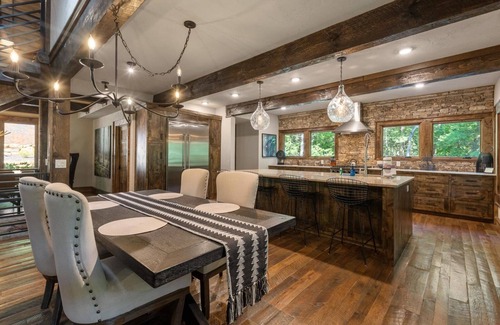 Upon entry, hand hewn vaulted ceilings greet you and a formal dining room welcomes you, with its custom ten-foot hand cut dining table, vintage high-back cane chairs, and antler chandelier. A second Restoration Hardware dining table sits in the adjacent open-plan great room under a rasped iron candelabra. The extraordinary gourmet kitchen includes butler's kitchen and a second sink, dishwasher, and additional prep counter space. The living room boasts elegance with a grand 16-foot stone fireplace with touch-light starter and timer, 75" mounted flat panel TV, handmade leather sectional sofa and armchair, and dramatic floor-to-ceiling glass doors that open to the top floor outdoor party deck complete with an outdoor kitchen, wood burning fireplace and sounds of the Ellijay River. The chef's kitchen includes a twelve-foot marble island, Viking appliances, a large picture window with views of the Ellijay River and is perfect for entertaining every family member.