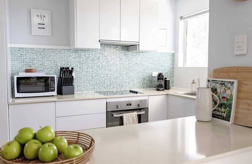 The laundry is situated behind sliding doors and comes equipped with a washing machine, washing baskets, pegs, iron, & ironing board. There is a drying rack available or communal washing lines in the back grassed section of the block. Basic cleaning equipment such as a vacuum & mop are also provided.