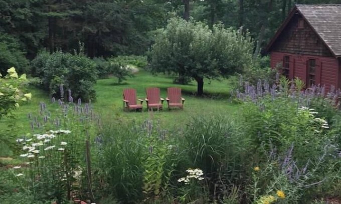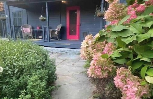This is a magical room with large old granite stones making up one wall and a bank of windows making up another. The french door opens to a large screened-in porch which overlooks a waterfall. With an antique four poster canopy bed and a tile floor with Turkish rug, you are sure to want to relax here. But nature is calling and you will also be inclined to wander along the water fall or out into the pavilion, gardens and orchard. Its a perfect place to just breathe. Please note that two cats and one dog live in this house (NOT in this room!)