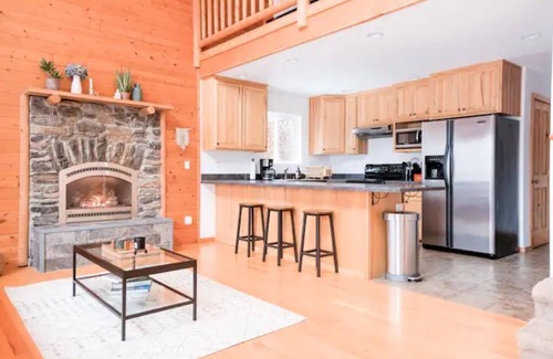 The cabin can comfortably accommodate up to 8 people. The home has an open floor plan with vaulted a-frame ceilings and a lofted second story featuring wood paneling throughout. A two-story wall of South facing windows lets natural light and mountain views fill the home. The gas fireplace completes the cozy atmosphere.