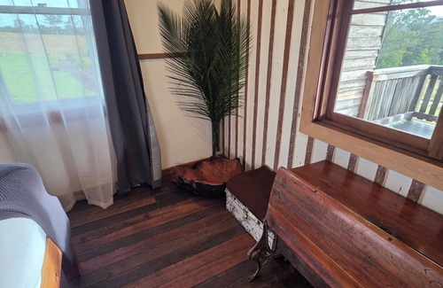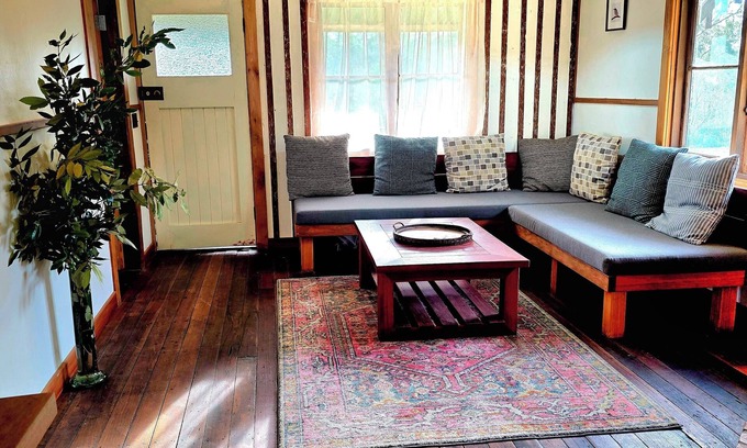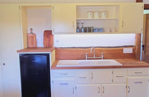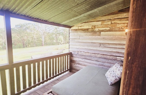 The River Stone Cottage is a lovingly restored timber worker's house with two bedrooms, each featuring a king-sized bed, ceiling fans, and scenic landscape views. The living room side of the original double chimney has a true north wood fireplace, while the kitchen side has a gas cooktop and exhaust. The kitchen features a double sink set in a Spotted Gum slab top and an open-plan dining space. The lounge room has plenty of space to relax, and the corner couch can double as two single beds. There is also a daybed on the front porch for stargazing. The separate external bathroom, located off the back porch, features a large river rock and tiled shower with a Coachwood vanity, sink, and toilet.