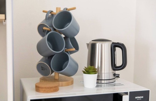 Fully equipped kitchen with refrigerator microwave oven electric kettle tableware glasses mugs and cooking utensils Relax in the dining area