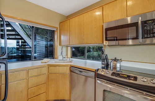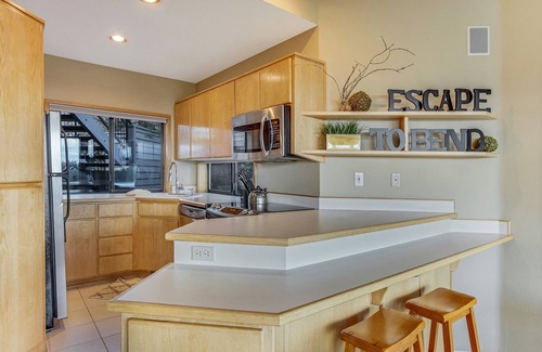 In the condo itself you'll find all the necessities for a comfortable vacation. The kitchen is equipped with everything you will need to prepare meals, including updated stainless steel appliances. A gas grill is located on the deck, along with table and chairs for outdoor dining. Inside, there is seated dining for four, as well as breakfast bar seating for two. The living room has a large sectional couch and gas fireplace, perfect for relaxing.