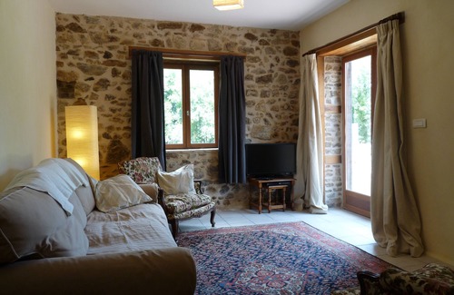 Two steps lead into the large dinning room and living room. An oak table and chairs provide the internal eating area with modern comfy sofas (including a king size bed settee) and restored furniture from the region in the relaxed living area.