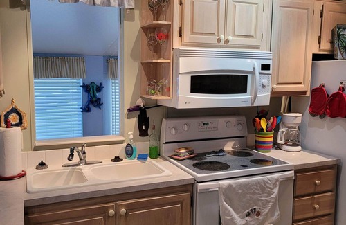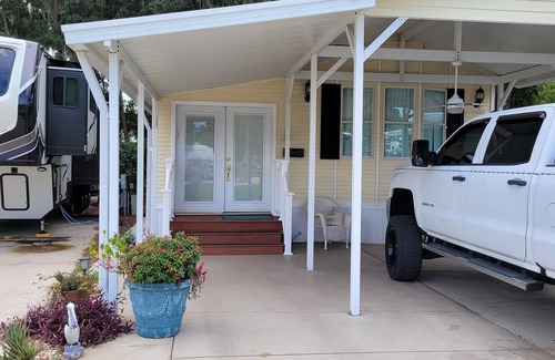 One of the few park models with a River view from the backyard and home. The 1 BR-1BA park model is located in the Lazy Days Resort in Welaka, FL. There is an attached sunroom with a double bed and room divider for privacy as well as a comfortable double futon in the living room area. Sleeps a total of 7 people. The home has an additional screened-in porch and deck located at the back of the property with a gorgeous view overlooking the river! You also have use of a community pool, dock, fish cleaning station and boat slip. The rental is very close to several of the favorite "local" watering holes and restaurants and we offer a golfcart for a small additional fee. Bring your boat or rent one locally to fish or spend a leisurely day at one of the nearby springs. The Manatees come into the springs during the cold months and they are awesome to see.