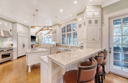 Six bedrooms allow for larger parties, with both tucked away private spaces and large gathering spaces. An attached guest cottage provides extra privacy and the convenience of a full separate kitchen. Read a book in the mahogany paneled library, or play a game of pool in the billiard room. 90 Otter Island has what you need to make a special Kiawah memory.
