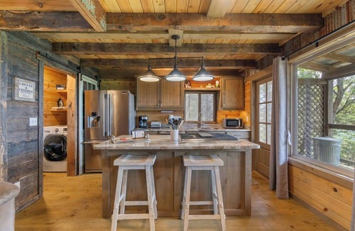 This thoughtfully designed one-bedroom cabin offers rustic style with all the comforts of home, wrapped in custom-built craftsmanship.