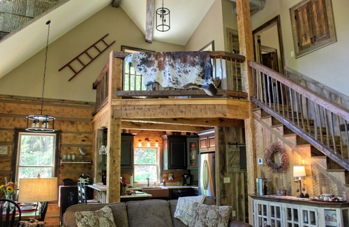 The cabin offers a master suite with a handcrafted locust king size bed with pillow top mattress on the main level with a private bathroom and large tile shower. The upstairs bedroom has a queen size bed with pillow top mattress and it’s own bathroom. The loft area is well equipped with a full size sofa pullout sleeper overlooking the living area. There is also a queen size sleeper sofa in the living area. The kitchen has most everything for your cooking needs.. The living area is equipped with a large flat screen television and a fireplace/entertainment center. Both bedrooms also have flat screen as well. The cabin has Direct Now internet television as well as WiFi. With one bedroom and bathroom upstairs and one bedroom and bathroom downstairs it is a perfect spot for two couples to have plenty of privacy. Open up the huge glass doors and let the lullaby of the river coming around the bend echo through the cabin. Don’t forget the front porch where you will want to spend most of your time taking in the view and listening to the soothing sounds of nature. Watch closely for the huge cranes, hawks, geese, ducks and bald eagles that patrol the river. With the cabin being on the rivers edge you will most likely see some type of wildlife during your stay, there are coyotes, turkeys, deer, bear, squirrels, etc. Don’t be surprised to wake up to the cattle walking by just outside in the morning. With the long range Mountain View driveway leading to the cabin and the waterfront location this is a truly one of a kind property.