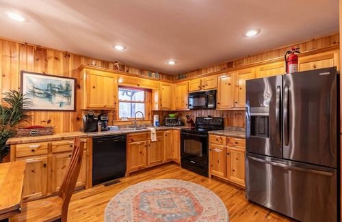 The living room features beautiful hard wood flooring, a gas-log fireplace, flat screen TV with surround sound and cozy furniture! The nearby kitchen is well stocked for your nights spent at home cooking for the family. There is enough room at the dining table to hold 6 people. The master bedroom is on the main level and features a king size bed with an ensuite bathroom. There are three other bedrooms on the upper level, two of which have queen beds. The other bedroom features custom log style bunk beds.