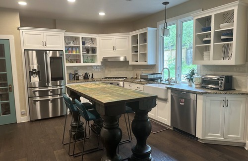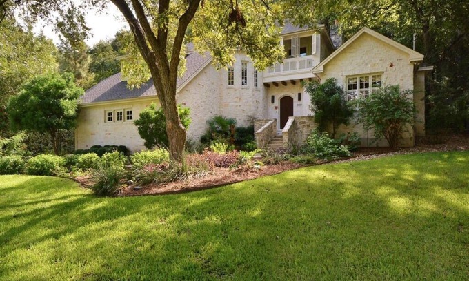 Enjoy an escape just off Lake Austin with family and friends. Relax all day in the backyard oasis pool to cool off or warm up in the hot tub both built into the base of a lush boulder and tree-covered hillside. Then stroll under the mature pecan grove (less than 5 minutes) to the private 2-story dock to lounge on the large lake floats or soak up the sun on the deck (boat slip not part of rental). Stay entertained with indoor/outdoor surround sound, a media room with an 80" QLED Smart TV, a record player with classic and current hits, and a piano in the library. The large living room is great for getting everyone together, but most people are drawn to the spacious kitchen and attached parlor room with a bar & fireplace. We always have Organic foods in the fridge & natural wines/spirits that you're welcome to and a garden most of the year you can pick fresh produce from. We don't use harsh chemicals in the house or yard. The setting is very natural with native plants and animals, including hummingbirds that come to the feeders outside kitchen window daily. Other dates can be made available, inquire if your trip doesn't quite fit in our currently-available dates!