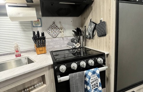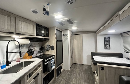 Step inside this thoughtfully appointed RV, where modern comfort blends seamlessly with the beauty of nature. The spacious layout includes a master suite with a luxurious king-sized bed and a second bedroom featuring three twin beds and a full-sized futon—perfect for winding down after a day of exploring.