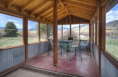 A firepit along the banks of the Rio Grande River is ideal for gathering with friends and family and enjoying the mesmerizing views of the river and the San Juan Mountain beyond. A screened-in patio provides a comfortable space for entertaining outdoors while protecting your guests from the elements.
