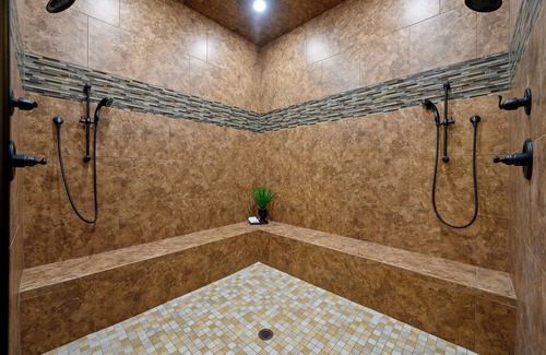 When you walk upstairs, you will enter a sitting area that has a cozy feel with a chaise lounge sectional and a bean bag chair. There is also a coffee bar, sink and a mini fridge in this area. If the guests upstairs are early risers, they can have their coffee upstairs, so they don't disturb the downstairs guests. When you leave the sitting area to the main hallway, there is a full built in bunk. The king master suite upstairs has a double vanity and white tile shower. There is an entrance to the outdoor deck from the sitting area, and the king master suite that has a beautiful river view. At the end of the hallway, there are two built-in queen beds and a vanity with a sink area. The second bathroom upstairs has two vanities and a tub/shower. There are smart TVs in every room with the exception of the bunk room. There is a smart tv in the sitting area as well.