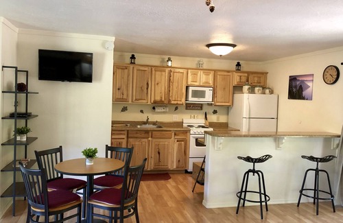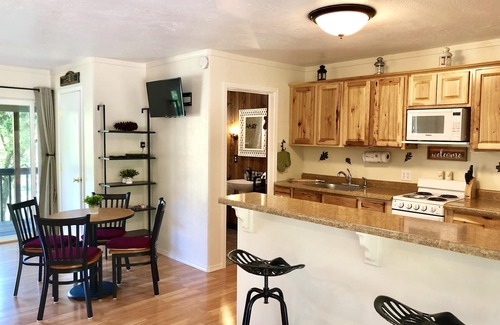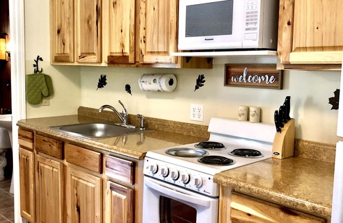 This large studio cabin features a cozy open living space adorned with rich colors and new furnishings to create an inviting atmosphere. Enjoy modern amenities such as a fully equipped kitchen, dinette set for four, and a comfortable memory foam mattress for restful nights. Step outside onto the wrap-around deck, where outdoor counter-height patio chairs provide a scenic spot to unwind, while a small fire pit and BBQ grill are perfect for evening gatherings. Additional conveniences include WiFi access, a washer and dryer in the garage, and board games for some quality family time.