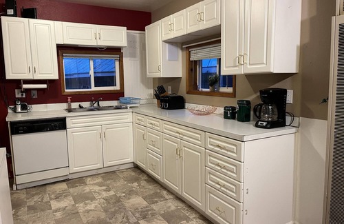 Our riverfront home accommodates a maximum of 7 people in three upstairs bedrooms; including a queen bed, double and twin bed. There is an additional double futon located in the upstairs loft, adjacent to the upstairs bathroom. The second bathroom is located on the main floor adjacent to the full-size washer and dryer. The home is furnished with linens, towels, blankets and a well-stocked kitchen.