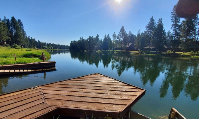 Big Deschutes Rivers Edge Charming Cabin-2 bd/1 bath - sleeps 7. Grab a good book and enjoy the Beautiful expansive Riverview from deck fire pit area, or relax in the hot tub with the same amazing views after a day of kayaking on the river. Kitchen fully stocked, Smart Tv's in bedrooms and living room, Game room w/ping pong table, smart TV and karaoke machine, 2 big kid bikes, 2 kayaks & life jackets, botchy ball, ladder toss, play a friendly game of horse shoes (located at the back side of house next to chain link fence) or just sit back and watch all the wildlife. Local eateries, unique shops, and adventure charters await in the Village at Sunriver which is about a 5-minute drive from our vacation rental. Only approx. 3.5 miles to the Sunriver bike path entrance by Harper bridge to enjoy miles of bike paths, 19 miles to Mt. Bachelor for a day in the snow & 27 min to Bend. We love our little piece of heaven, and you will too!