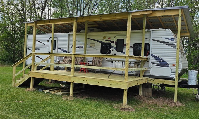This Cozy Camper is located right beside the river. Relax and unwind on the covered porch. Two comfy queen beds and private bath. Full kitchen & eating area . River bar area for gathering and grilling. Restaurants & shopping minutes away.