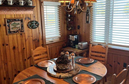 The newly remodeled kitchen has full-size Stainless-Steel Appliances, a hammered copper farm sink with industrial style faucet, and a cook's Pot Filler above the stove. The eye level microwave above the stove makes it easy to warm up left-overs and pizza slices. The dishes and glassware have a colorful trout theme. The silverware has hammered copper handles, reminiscent of the areas' copper mines.