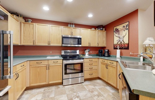 The well-stocked kitchen is equipped with a double stainless-steel sink and a full suite of appliances. Spend quiet mornings sipping coffee at the breakfast bar with two chairs, and gather for brunch in the dining area, where an antler chandelier hangs above a wood table set for four. Get some fresh air on the private balcony overlooking the Eagle River and the surrounding mountains. In the evenings, fire up the grill and dine al fresco at a bistro table with seating for two. Amenities include complimentary Wi-Fi and a washer/dryer set.