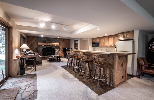 Our home offers a peaceful Great Room overlooking the Big Thompson River with vaulted ceilings, a floor-to-ceiling rock fireplace, game table area, large dining table and a beautiful, well-equipped kitchen featuring granite countertops. On the lower level, there's another bedroom with two pine log twin beds, bathroom, kitchen, cozy family room with fireplace, game table, and huge game room featuring ping pong, arcade games, foosball and 55-inch TV. From the lower level, you can walk right out to the river to fish, relax or even soak your tired feet.