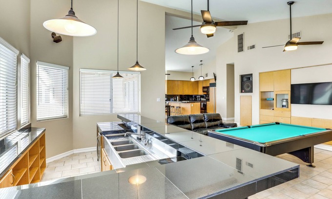 Nestled along the Colorado River, this 3-bedroom, 3-bath vacation rental home in Parker, AZ, is the perfect place to unwind and reconnect with loved ones. Fish from the private dock or grill out on the patio while you take in tranquil water views. For more outdoor fun, explore River Island State Park or take a day trip to London Bridge! Staying inside? Enjoy a drink at the spacious wet bar while the kids play a friendly game of pool.