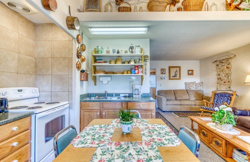 Inside this Charleston vacation retreat, an open floor plan has ample room for socializing, enjoying the warmth from the cozy pellet stove, and watching TV or a DVD. There's also WiFi here so you'll be be able to stay connected even while relaxing at this cute and private Oregon Coast oasis.