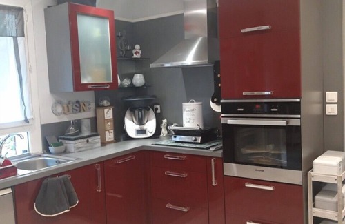 - Large living room with fitted kitchen (induction hob, microwave, oven, fridge, freezer, dishwasher ....) and fireplace with pellet insert