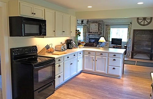 The kitchen is exceptionally well equipped, with ample counter space and a large breakfast bar with 3 bar stools, opening to the great room. The great room features a gas fireplace with stonework flanked by magnificent picture windows looking out on a grove of trees, lawn and down to the river with mountain views beyond. The gas fireplace warms the living space and creates cozy ambiance during winter. A small writing table by a window nook in the great room provides an ideal space for reading, writing or using a laptop.