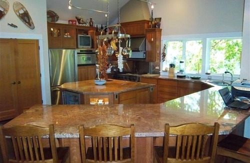 If you’re coming to Bend for a vacation, or business, why stay anywhere else! We will accommodate you even if it’s just you and a guest. This spectacular home is on the Deschutes River just North of downtown Bend on the mile long stretch of river just below Pioneer Park. This slow moving and breathtaking section of the Deschutes river is an Icon to those that live here and enjoyed by all that hike along her banks. The house has a private dock, kayaks and a canoe for your paddling enjoyment right off the back lawn.