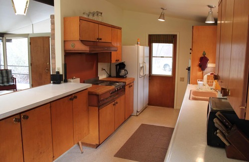 This casual air-conditioned home has two bedrooms (with 1 split-king and 2 twin beds) and one bathroom with a walk-in (step-down) shower. A total of 4-7 people can be accommodated utilizing the additional facilities provided in the family room (sofa and mattress pads). This North Fork Kaweah River gem includes an all-electric kitchen with a new refrigerator, two ovens, stovetop, microwave, DVD/TV players, BBQ, fire pit, games, and wireless fiber internet service.