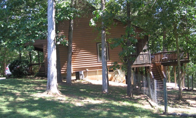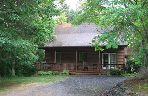 The cabin sleeps 6 comfortably, with 2 bedrooms and a loft. The downstairs bedroom has a queen bed, upstairs bedrooms has 2 double beds and a half bath, and the loft outside the upstairs bedroom has a futon. The downstairs bathroom is divided into 2 separate rooms next to each other, one includes the toilet and vanity, the other a walk in shower and whirlpool bath. (user friendly) The kitchen has updated appliances and includes a microwave, toaster, blender, and combo coffeemaker. The dining area seats 6, and leads out to the screened in porch with another table to dine. There is an open deck beside the screened in porch that also has a table and a gas grill. The living room has a sofa with 2 reclining sides, a separate recliner situated around the gas fireplace. The front porch has a swing and other seating.