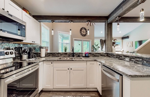 Ideal for extended family stays and friend retreats, the Tahuya River Lodge boasts three separate cabins! Inside, each cabin has a lovely updated living room adorned with soft seating and a large TV. The full kitchens are positively gleaming with their stainless steel appliances, granite countertops, and breakfast bars. Remote workers and gamers alike will appreciate the office space available in two of the cabins.