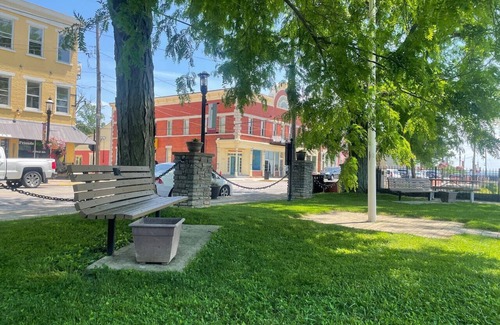 You’ll sleep comfortably in a queen-size bed with crisp white linens and room-darkening shades in the bedroom. In the living room, two oversized windows frame sweeping sunset views of the Ohio River and riverside park—a perfect perch to watch birds overhead or ducks gliding below. The town winds down early, so nights here are wonderfully quiet.