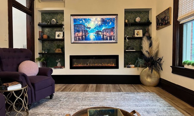 There are multiple cozy places to read or relax, and the kitchen table makes a great spot for a board game, a casual meal, or remote work. Whether you’re curling up by the electric fireplace wall, streaming a movie, or enjoying a book from the curated collection, every part of the space is designed to inspire comfort and ease.