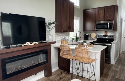 The Riverfront Tiny House features a cozy bedroom and a comfortable couch, making it an ideal space for relaxation after your wedding festivities. The fully equipped kitchen allows for easy meal preparations, while modern amenities like a washer/dryer, central heating, and air conditioning ensure your stay is comfortable. With access to a fenced-in area and outdoor activities like fishing and kayaking, you can easily enhance your celebration with unforgettable experiences under the stars, including stunning sunsets and lightening bug displays during summer nights.