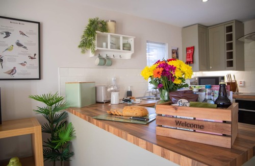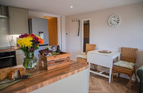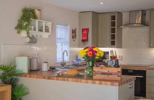 The fully equipped kitchen includes a toaster, kettle, microwave, hob, oven, fridge freezer, and a Tassimo coffee machine, providing everything you need for a convenient self-catering experience.
