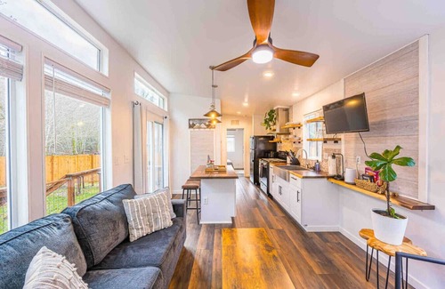 Escape to the Pacific Northwest for a serene stay at this modern tiny home situated on Morse Creek. Built-in 2020, this contemporary abode offers a spacious feel despite its compact size, with tall ceilings and an open layout. Sleeping four comfortably, it boasts a full kitchen, bar seating, a dining area, and a cozy living room. Choose between the double bed and double sofa bed for a restful night's sleep. Cooking is a breeze with the fully-equipped kitchen, complete with cookware, appliances, and utensils.