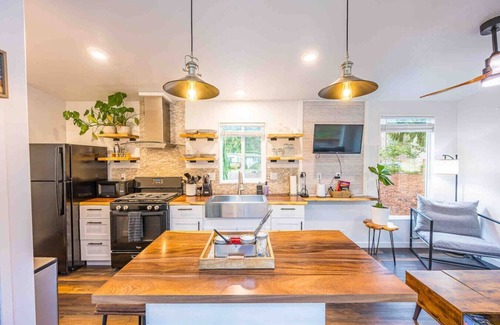 Guests will have access to the entire home, abundant parking, free wifi, complimentary coffee, and smores. Outside, Guests will have access to a wrap-around patio overlooking the creek, a private outdoor lounge area with a fireplace, a supply of firewood, and a backyard with a fire pit.