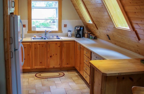The home features two sleeping corridors upstairs- a master bedroom with a king sized bed and a top balcony overlooking the river. The adjoining room has two twin beds. The downstairs living room is centered around a cozy fire place and is equipped with a television, books, and games for rainy days. Full bath with an oversized clawfoot tub and shower combo. Modern kitchen supplied with all the creature comforts from home and a full size dinning table. Outdoor patio with a gas grill and ample amount of seating.