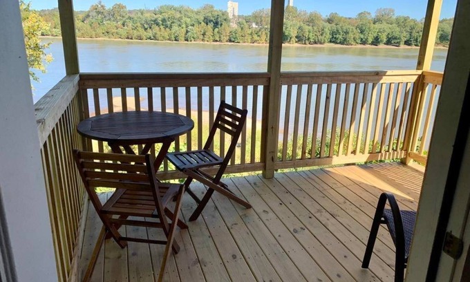 Get away and recuperate! Nestled in the trees high above the water, the Overlook Cabin offers a peaceful, comfortable, and intimate experience of the Ohio River, with a large riverfront window, 8x12ft deck, & jacuzzi bath. The 12x40ft space has a queen bed, two twins, and a couch, and would be great for families, hunters, or couples. Dogs/cats welcome. Each night's stay includes two made-from-scratch Breakfasts (up to a $26 value), with all food being delivered directly to your door. Cabins are also stocked with complimentary locally-sourced coffee. There is a large outdoor area for kids to play or for a picnic or campfire, a gas grill, climbing dome, and a path directly down to the river for hiking or fishing. Lots of hiking/hunting in the area, about four miles from a boat launch (KH Butler), and 10-15-minutes from a cute little town. Free parking on site. Free wifi. Smart TV & DVD player available. Owners live onsite should any issues arise.